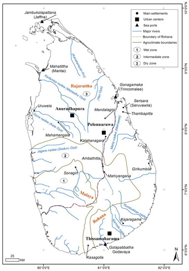 The ancient Rajarata kingdom flourished in the present-day North Central Province of Sri Lanka from the 6th century BCE to the 13th century CE, and mainly consisted of current districts of Anuradhapura and Polonnaruva (Figure 1). The dry zone is characterized by mean annual precipitation of 1750 mm and a distinct dry period during the summer months [1]. Therefore, inhabitance of the dry zone of Sri Lanka is completely dependent on irrigation agriculture. From ancient times, people of the island constructed irrigation works ranging in complexity from simple dams to an integrated watershed management system [2].