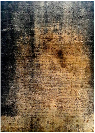 A lithic inscription tradition was established on the island from the 3rd century BCE onwards [41,56] (Figure 2). The earliest cave inscriptions were denoted to record various dedications to the monks and the names of donators in a contemporary manner [56]. In later periods, many rock and slab inscriptions were made to record predominantly common acts such as donations to the monasteries. Furthermore, some inscriptions contained details on bureaucracy and regulations for the local community [57]. English translations of the inscriptions originating from the 3rd century BCE to the 17th century CE were extensively studied [56,58,59,60,61,62,63,64,65,66,67,68,69,70,71,72,73,74]. In accordance with the general procedure, ancient lithic inscriptions in Sri Lanka were divided into four different categories based on the paleography [57]: