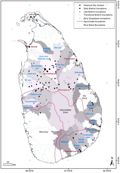 Spatial distribution of lithic inscriptions in Sri Lanka containing information on ancient water governance structures correlated with the river basins. (Relative locations of the inscriptions were assigned by correlating the place names mentioned in the official English translations of the inscriptions with 1:50,000 topographic data compiled by the Sri Lanka Survey Department. Agro climate boundaries are based on the National Atlas of Sri Lanka [22]).