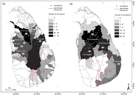 A total of 194 inscriptions out of 201 registered inscriptions were geocoded using the places of origin mentioned in the inscription volumes (Figure 2). Turning to the spatial distribution of the inscriptions (Figure 4 and Figure 5a), the majority, 53 records (27%), originate from the Aruvi Aru-Malwathu Oya river basin. Another 36 inscriptions (19%) are located in the Mahaweli river basin, while 21 inscriptions originate from the Kala Oya river basin (n = 21; 11%), 15 (8%) from the Mi Oya river basin and 12 (6%) from the Yan Oya river basin; less than 5% of the inscriptions originate from other river basins (Figure 4 and Figure 5a). Likewise, 42% of the inscriptions (n = 81) are in the present-day district of Anuradhapura and 18% are in the Polonnaruva district (n = 35).