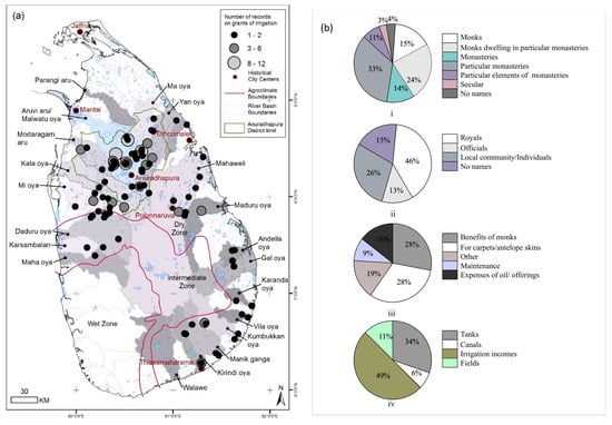Most grants (46%) came from kings and elite groups (Figure 6b-ii). In addition, the local community provided a considerable number of grants (26%). 15% of the grants were mentioned without naming granters and another 13% were granted by government officials (Figure 6b-ii). Grants of irrigation in ancient times were mainly based on religious purposes (Figure 6b-iii). In only a few instances were secular grants mentioned, such as when King Datusena (reign: 459–477 CE) granted half of the share of the Kalavapi (Kala wewa tank; Kalavapimhi bhagaddham) to his brother Kumarasena (Culavamsa XXXVIII/53). Accordingly, 28% of the records refer to grants for the benefits of monks and 28% to grants for carpets/antelope skins in the monasteries (Figure 6b-iii). 16% of the records relate to grants for the expense of oil and offerings in monasteries and another 19% of the records of grants of irrigation relate to other purposes (Figure 6b-iii). 9% of the records of grants of irrigation relate to maintenance purposes.