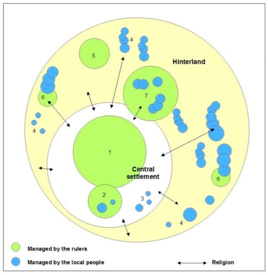 Most recently, Coningham attempted to study ancient water governance structures in the Rajarata kingdom based on archaeological and historical materials [31,32]. He described the water management system of the kingdom of Anuradhapura as a theocratic landscape where monastic centers played a dual role of religious and secular administration, based on grants of irrigation works to monastic entities and the absence of towns and lower-order administrative centers in the hinterland.