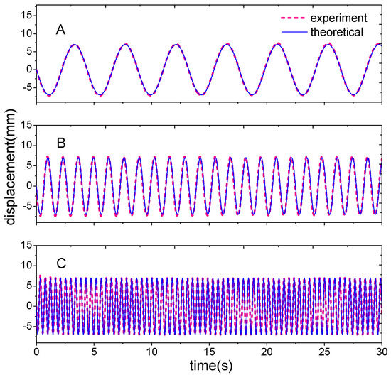 Figure 3. The comparisons of both the actual motion platform displacement and theoretical displacement (amplitude is 7 mm, ωA = 1.425 rad/s, ωB = 4.749 rad/s, ωC = 14.249 rad/s).