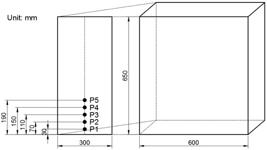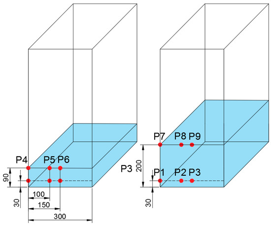 In the experimental study, two filling levels, 13.8% and 30.8%, are considered. For measuring the dynamic impact pressure on the tank wall, five pressure sensors are embedded in the left wall, as shown in Figure 2. Their specific locations are illustrated in Figure 4. A camera was fixed in front of the rectangular tank to record the profile of the free surface.