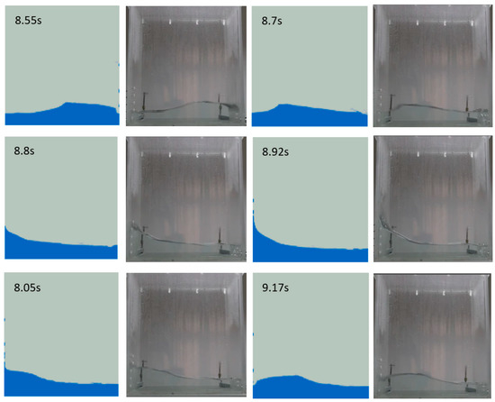 Figure 8. The numerical wave profile and experimental snapshot in six moments between 8.55 s and 9.17 s (amplitude is 7 mm, h = 90 mm, ω = ω1).