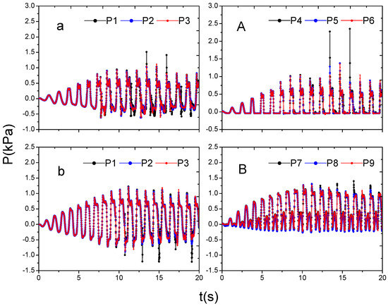 Figure 12. The comparison of impact pressure at different positions at the same height on the side wall. (a) h = 90 mm, ω = 1.06 ω1, pressure on the bottom, (A) h = 90 mm, ω = 1.06 ω1, pressure on the free surface, (b) h = 200 mm, ω = 0.96 ω1, pressure on the bottom, (B) h = 200 mm, ω = 0.96 ω1, pressure on the free surface.