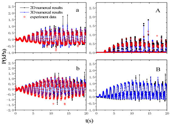 Figure 13. The comparison of the 2D and 3D numerical results (a) h = 90 mm, ω = 1.06 ω1, pressure on the bottom, (A) h = 90 mm, ω = 1.06 ω1, pressure on the free surface, (b) h = 200mm, ω = 0.96 ω1, pressure on the bottom, (B) h = 200 mm, ω = 0.96 ω1, pressure on the free surface.