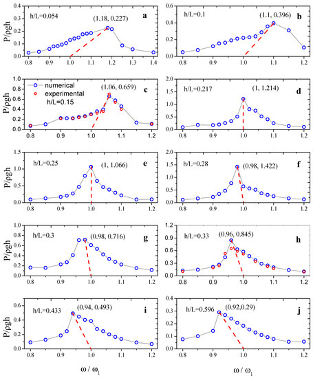Figure 16 shows the pressure-frequency response curves at 10 different filling levels. In Figure 16c–h, the corresponding experimental are also included for comparison, which, once again, show good agreements and reinforce the credibility of experimental and numerical models. In all the cases, the pressure increases as the frequency increases and then decreases afterword. However, at different filling levels, the rate of increase/decrease and the maximum response frequency are not the same. It can be clearly seen that when the filling level changes from low to high, the ascending process before the maximum response frequency becomes shorter, and the descending process after that becomes longer, the maximum response frequency (Marked in the Figure 16) decreases from 1.18 ω1 to 0.92 ω1 instead of keeping the first-mode natural frequency computed by the potential theory.