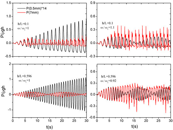 Based on the previous section’s conclusion that the external excitation amplitude has a linear effect on the sloshing pressure, the pressure of the A = 0.5 mm case has been expanded 14 times to compare with the pressure of the A = 7 mm case to investigate how the sloshing state will be if the wave cannot break. As shown in Figure 19, the two curves all coincide before wave breaking, but the difference happened after the waves break. A significant phase advance occurred in the pressure-time history curve of shallow water sloshing, and phase delay appears in the pressure-time history curve of shallow water sloshing. This result shows that wave breaking will change the period of liquid sloshing in the tank. In the condition of shallow water, the period of the liquid sloshing decrease with wave breaking, the maximum response can be achieved at an external excitation frequency greater than the natural frequency. As for deepwater sloshing, the period of the liquid sloshing goes up with the wave breaking, so the system resonance can be excited at an external excitation frequency lower than the natural frequency. These are the root causes of resonant hysteresis and resonance in advance.