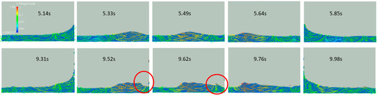 Figure 20. The fluid phenomenon in shallow water sloshing (h/L = 0.1, ω/ω1 = 1.1, A = 7 mm, the falling liquid hits the free surface in the red circle).