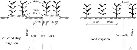 Three replications were adopted for each plot. In Plot I, each replication contained one soil profile located in the middle of the two rows of maize, and the spacing between two rows of maize was 60 cm. In Plot II, the technology of “drip irrigation + ridge planting + plastic mulching” with maize planting in double rows at one width ridge was implemented, and each replication consisted of three soil profiles, namely, the middle position of ridge tillage (MRT), edge of plastic film (EPF), and middle position of bare furrow (MBF) (Figure 1). The spacing between two rows of maize was 40 cm, and the three soil profiles were 30 cm apart from one another. Soil water content was measured at an interval of 10 cm in the vertical direction for each soil profile, and the maximum monitoring depth was 150 cm. The cropping patterns and observation profiles under the two irrigation methods are shown in Figure 1. Soil water content in each soil profile was measured approximately every 10 days. One further measurement was added in the case of rainfall or irrigation events. At the start of the growing season, soil samples from the two plots were collected by auger in the vertical direction along the 4 m soil profiles with intervals of 10 cm at 0–2 m and 20 cm at 2–4 m. The gravimetric soil water content of each soil sample was measured through the oven-dry method, and the measured value was converted into the volumetric soil water content by multiplying it with soil bulk density, which was determined by dividing the soil dry mass in the sampling ring with the sampling ring volume.