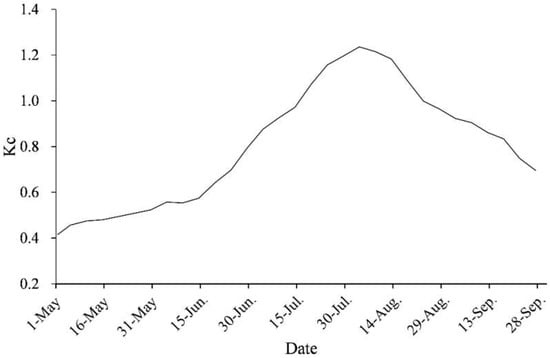 Potential evaporation and transpiration are required as inputs in Hydrus-2D. These were calculated according to the measured leaf area index () and crop coefficient of maize (, as shown in Figure 2), as follows: