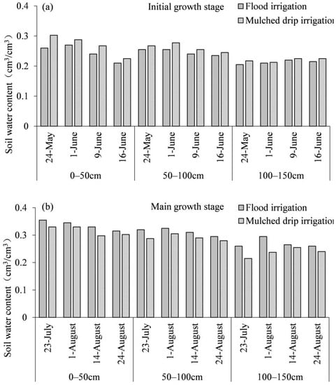 The soil water content under the two irrigation methods are shown in Figure 3. In the initial growth stage, the difference in soil water content between mulched drip irrigation and flood irrigation was mainly within a depth of 1 m. The soil water content under mulched drip irrigation was greater than that of flood irrigation, and the relative difference between the two irrigation methods was 7.9% within 1 m. In particular, within 50 cm, the relative difference between the two irrigation methods was 9.9%. At depths of 50–100 cm and 100–150 cm, the relative difference between the two irrigation methods were 5.9% and 3.5%, respectively. In the main growth stage, the soil water content along the 150 cm soil profile under mulched drip irrigation was smaller than the value under flood irrigation. Specifically, the relative difference between the two irrigation methods were 6.5%, 7.3%, and 13.1% at depths of 0–50 cm, 50–100 cm, and 100–150 cm, respectively. In short, the soil water content under mulched drip irrigation was generally greater than that of flood irrigation in the initial growth stage. However, an opposite trend was observed in the main growth stage.