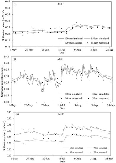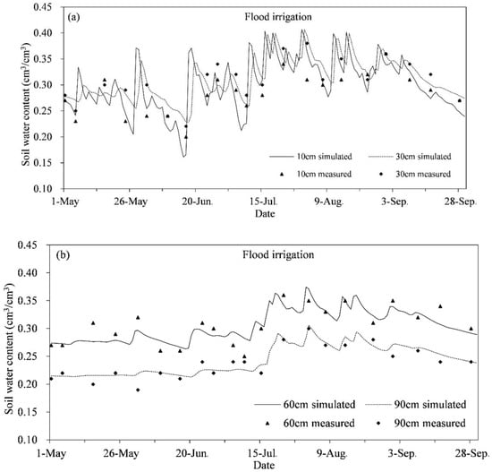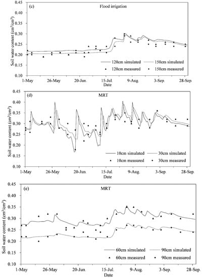 The measured soil water content under flood irrigation was used for calibration and that under mulched drip irrigation was used for validation. Based on the model calibration results, the optimized soil hydraulic parameters are summarized in Table 3. The simulated and measured values for soil water content under the two irrigation methods at different soil depths are shown in Figure 4. The simulated soil water content had the same trend as the measured one. The statistical evaluation results for model performance in , , and are summarized in Table 4. For the calibration analysis, the and values for soil water content were between 0.009 and 0.022 cm3/cm3 and between 0.048 and 0.089, respectively. For the validation analysis, the and values in MRT were between 0.008 and 0.018 cm3/cm3 and between 0.046 and 0.085, respectively, and the and values in MBF were between 0.009 and 0.019 cm3/cm3 and between 0.047 and 0.074, respectively. The values were in the range of 0.58 to 0.86 for flood irrigation, and 0.35 to 0.76 for mulched drip irrigation. The average values of , , and for flood irrigation, MRT, and MBF were 0.014, 0.013, and 0.012 cm3/cm3, 0.061, 0.059, and 0.055, and 0.753, 0.614, 0.653, respectively. From the graphical and statistical results, the simulated and measured soil water content showed good agreement.
