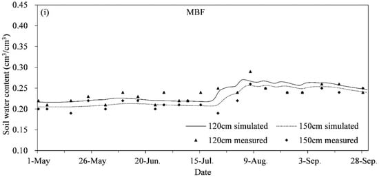 Simulated and measured soil water content at different soil depths under the two irrigation methods. (a–c): Soil water content under flood irrigation at 10, 30, 60, 90, 120, 150 cm, respectively; (d–f): Soil water content of MRT under mulched drip irrigation at 10, 30, 60, 90, 120, 150 cm, respectively; (g–i): Soil water content of MBF under mulched drip irrigation at 10, 30, 60, 90, 120, 150 cm, respectively.