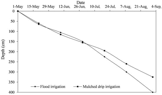 Different results of infiltration depth over time under mulched drip irrigation and flood irrigation are shown in Figure 6. On the 122nd day of the simulation, the infiltration depth under flood irrigation reached the maximum simulated depth (400 cm). At the same time, the infiltration depth under mulched drip irrigation was 325 cm, which was 75 cm smaller than the infiltration depth under flood irrigation. According to the differences in infiltration depth under the two irrigation methods, the infiltration process throughout the entire growing season could be generally divided into two stages.