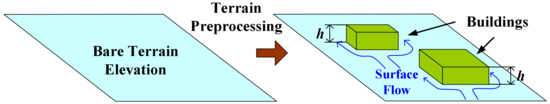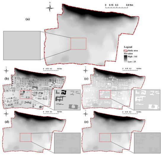 For building representation mean, the bare-earth DEM that is shown in Figure 5a was preprocessed based on the algorithms of the different building treatment methods, as follows: