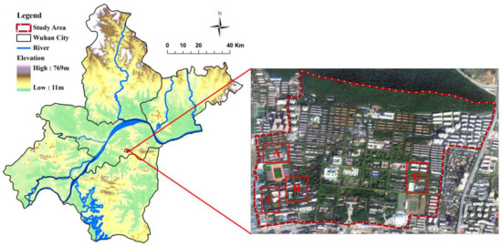 In this paper, the main campus of Huazhong University of Science and Technology (HUST) in Wuhan City, China, was selected as the study area. Wuhan City lies to the east of the Jianghan Plain, and the intersection of the middle reaches of the Yangtze and Han Rivers. Wuhan has a subtropical humid monsoon climate with a mean annual precipitation of 1269 mm over the last 30 years. The study area is situated in the southeast of Wuhan City and covers a total area of approximately 1.96 km2, with an elevation varying from 25 m to 141 m above sea level. As can be seen in the satellite image from Figure 2, the campus consists of a combination of track grounds, school buildings, and student apartment blocks within a topologically regular grid network of streets, and some open areas with forest cover and shrub cover in the southern and northern borders, and there is no significant water system that lies in or flows across the campus.