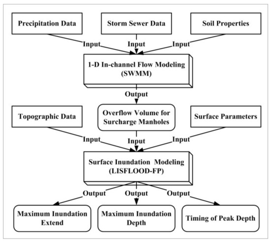 To simulate a flood inundation map for the study area, we introduced a coupled urban flood inundation model based on a 1D module in the SWMM model and a simplified 2D model in LISFLOOD, as shown in Figure 3.