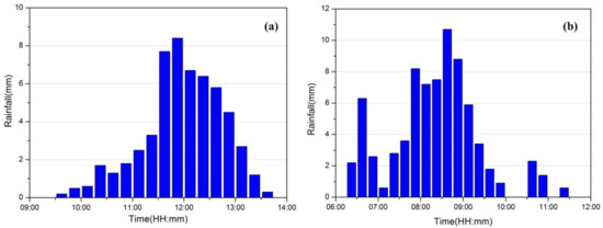 Rainfall records of the flood events that occurred on 20 June 2016 (a) and 1 July 2016 (b) at Wuhan City.