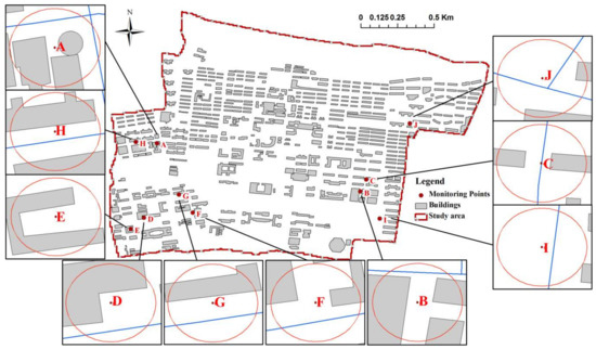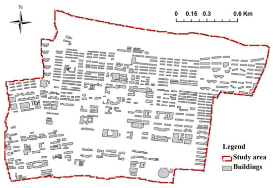 The geometry of the buildings was obtained from the Planning and Design Office of HUST. These were manually validated using the Google Street Map and were then organized as a polygon geometry layer in ArcGIS (Figure 6). There are approximately 498 buildings in the study area, which are densely distributed along the roads of the campus.