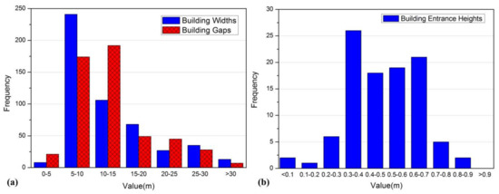 Histogram of building parameters in the study area: (a) building sizes and gaps; and (b) building entrance heights.