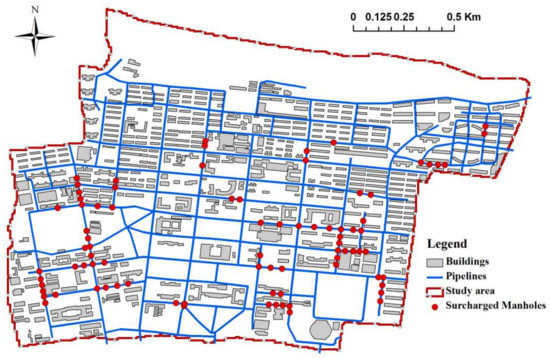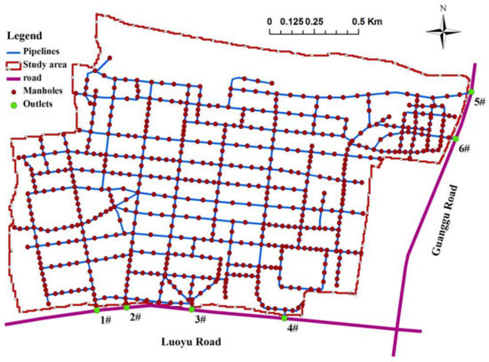 As no significant water system can be found on the satellite image, surface runoff in the study area appears to be mainly drained by the storm sewer system and to finally be discharged into the main sewer under Luoyu Road and Guanggu Road. Figure 8 describes the geospatial and geometric information of the storm sewer system in the study area, which was obtained from the Planning and Design Office of HUST. The storm sewer system consists of 54 pipelines, 617 manholes and six outlets numbered from #1 to #6, of which #1 to #4 are the outlets leading to Luoyu Road on the south side of the campus, and #5 and #6 are located under Guanggu Road on the east side.