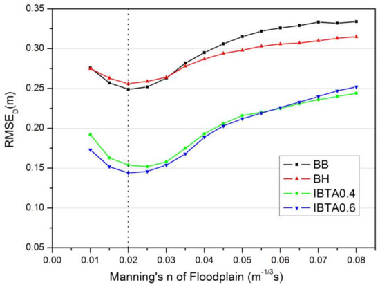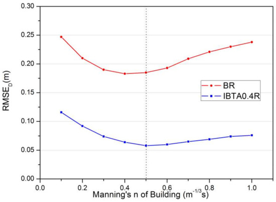 Model response of RMSED for varying Manning’s n value of buildings. The dotted line represents the optimal Manning’s n value of buildings used in the BR and IBTA0.4R methods.