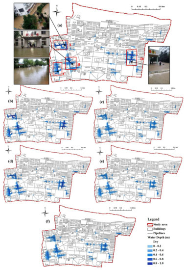 A summary of the maximum flood area and the inundation depth simulated by the models using different building treatment methods are presented in Figure 13. DEM cells that were simulated to be wet are rendered by different blue colors according to the maximum inundation depths, while cells with no color are dry. Overall, the size and shape of the inundation area resulting from each modeling scenario are similar. The wet cells mainly propagate along roads and accumulate in the southwestern and southeastern districts of the study area, which have low-lying topographies, and are generally consistent with the observed inundation zone accounts collected from eyewitnesses and historical photography within regions A to D in the flood event of 1 July 2016, as shown in Figure 13a. It appears that the simulated inundation area is characterized by an acceptable degree of consistency among all the modeling scenarios. As mentioned before, the simulated flood area is difficult to validate due to a lack of suitable observation data for the flood event, so the overall flood area and inundation depth differences between the modeling scenarios provided by each building treatment method were computed to reveal the model sensitivity to the building treatment method. A subset of results is given in Figure 14 and is described as follows.