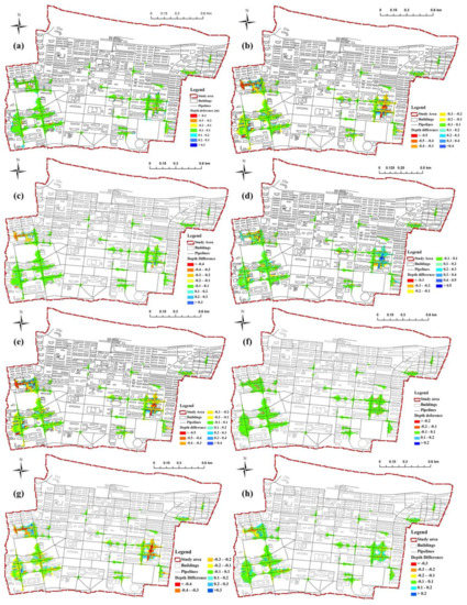 Differences in maximum inundation extent and inundation depth between two paired modeling scenarios: (a) BB-BH Methods; (b) IBTA0.4-BB methods; (c) IBTA0.6-BB methods; (d) IBTA0.6-IBTA0.4 methods; (e) IBTA0.4R-BB methods; (f) IBTA0.4R-IBTA0.4 methods; (g) BR-IBTA0.6 methods; and (h) BR-IBTA0.4R methods.