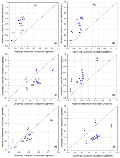 A comparison of observations and simulated maximum inundation depth at each monitoring point (from points A to J) resulted from different building treatment methods: (a) BB method; (b) BH method; (c) IBTA0.4 method; (d) IBTA0.6 method; (e) IBTA0.4R method; and (f) BR method.