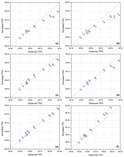 A comparison of observations and simulated timing of peak depth (TPD) at each monitoring point (from points A to J) resulted from varying building treatment methods: (a) BB method; (b) BH method; (c) IBTA0.4 method; (d) IBTA0.6 method; (e) IBTA0.4R method; and (f) BR method.