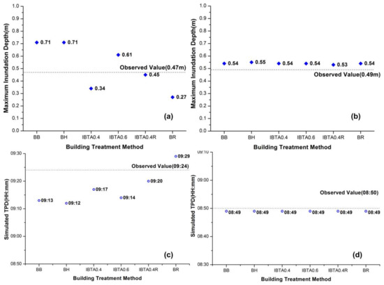 The 1 July 2016 flood event was used as the case event to validate the models using different building treatment methods. Same objective function as the calibration was applied to the validation process. RMSED was chosen as the indicator to assess the performance of proposed IBTA and traditional methods. The validation results of each building treatment method are given in Table 3. The IBTA0.4R method was tested to produce a preferable simulation of maximum inundation depth than the other methods. Similar to the calibration process, high RMSED can be found in the validation results produced by the traditional methods. However, we also found that the simulated maximum inundation depth at points I and J matched well with the observed data in every method, with RMSED smaller than 0.07 m. These results imply that poor performance of the traditional method was more likely to be due to the limited representation of building effects than to the unsuitable model parameters. Therefore, the model parameters were deemed applicative in the study area. In addition, detailed information for the validation results and performance of each building treatment method will be presented and discussed in Section 3.2.
