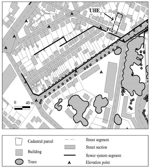 Catchment morphology is represented as a set of urban hydrological elements (UHE) connected to a hydrological network routing the flow toward the catchment outlet. The UHE includes a cadastral parcel and its neighboring street segments (Figure 1). The characteristics of the UHE are determined from common urban databanks consisting of surface area, impervious fraction, vegetation fraction, slope, length, location of connection point to the hydrological network, and the depth of the drainage network at this point. The hydrological network is composed of a series of connected street gutters and sewer conduits characterized by their length, slope and diameter [].