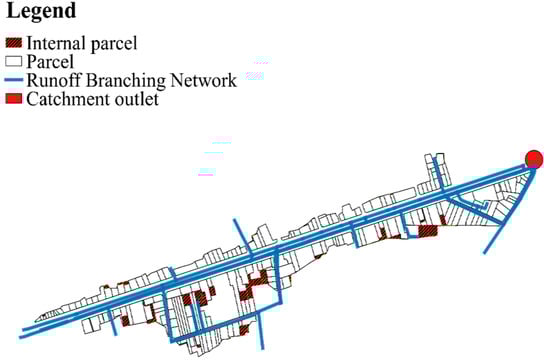 Input files were set up through the processing of the topographic and land use data derived from urban databanks, using two free GIS software: QGIS and OrbisGIS. Analysis of the data shows that the catchment encompasses 274 cadastral parcels, which represent as many individual UHEs (Figure 2). Among the 274 UHEs, 56 are not directly connected to an adjacent street, because they represent isolated parcels inside a block.