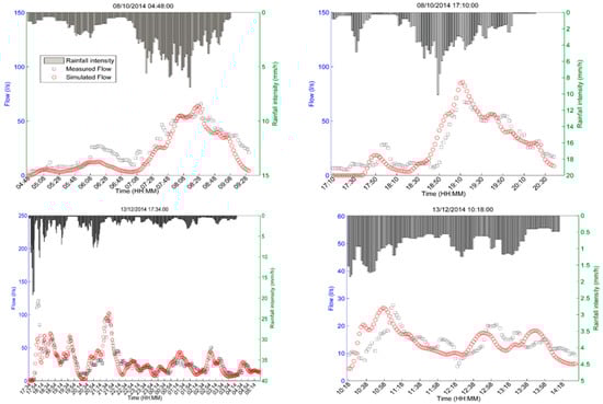Water flow simulations for four events from the period from 8 October 2014 to 31 December 2014. The simulated flow at the outlet is represented by red circles. The measured flow is represented by grey squares. The rainfall intensity is plotted on the upper part of the figures.