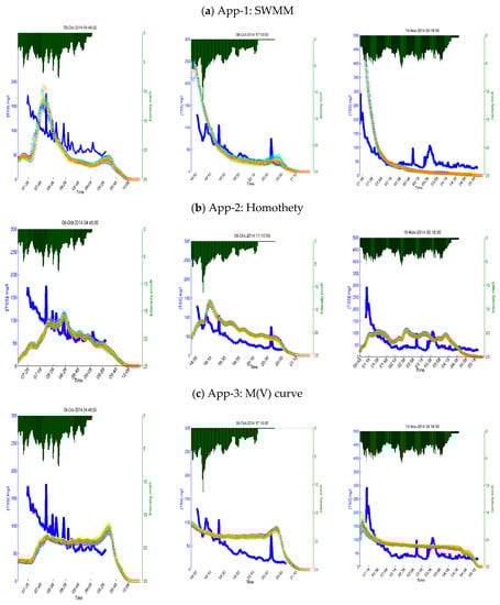 Best performance events based on TSS concentrations using CR² and the CRMSE criteria for two rainfall events on 8 October, and one on 15 November simulated with (a) App-1: SWMM, (b) App-2: Homothety and (c) App-3: M(V) curve. The rainfall intensity is plotted on the upper part of the graphs. The solid blue lines represent the measured TSS concentrations. The rainbow-colored lines marked with circles represent the simulated TSS concentrations, where each color represents the TSS concentrations for one simulation.
