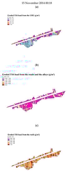 The spatial variability of the simulated eroded TSS loads (mean value) using the first approach (App-1) for the UHE, roads, alleys and roofs is presented in Figure 7 for the rainfall event on 15 November, which had the best performance.