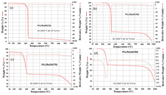 Figure 6). In addition, the decomposition temperatures are very sharp compared to pure polycaprolactone. The PCL/Ba (90/10) has a sharp decomposition temperature at around 335 °C, whereas PCL/Ba (50/50) has a decomposition temperature of 320 °C.