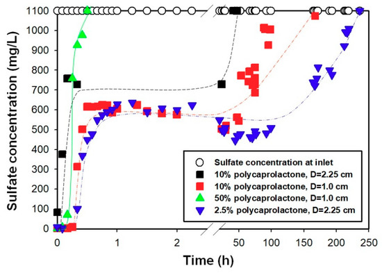 Figure 8 shows the sulfate removal of PCL/Ba composites with column tests. Symbols of white circles depict the influent sulfate concentration, which was kept constant at 1100 mg/L. There are two significant results shown in