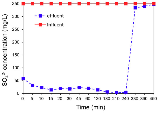 23] reported that only 61.4% of the influent sulfate was removed using the barium precipitation technique under a sulfate concentration of 80 g/L in the influent. In the present study, the effluent sulfate concentrations remained well below 30–50 mg/L for the first two hours except for an outlier seen at 1 hour, removing more than 90% of influent sulfate because lower sulfate concentration (328 mg/L) was fed into the column. Such promising results show that the media used in this study has a very high capacity to remove low concentrations of sulfate, and further studies are required in pilot scale to evaluate a long-term activity of these media.