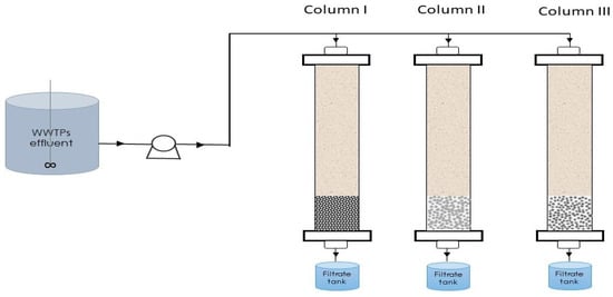 The experimental setup for adsorption study in the fixed-bed columns is shown in Figure 1. It consisted of three glass columns of 15 mm in diameter by 15 cm in length. The columns II and III were packed with compositions of sand and Ben-AC granules. Column I was a reference column containing layers of GAC and sand. The details about the loading of the columns are presented in Table 3. Wet-packing of the porous medium was used to minimize layering and air entrapment inside the filing. Columns were mounted vertically, and glass wool was used at the bottom of the column acting as supporting material of the adsorbent bed. After packing the column, deionized water was passed through the column for 2 h, followed by the introduction of the feed water. The flow rate was controlled by a peristaltic pump at 3 mL/min. A higher flow rate of 6 mL/min was also investigated in preliminary studies (data in the Supplementary Materials) and was found to be too high. This was due to the low reduction degree of typical water quality parameters. Many authors suggest that a high flow rate results in short contact time between adsorbate and adsorbent that decreases the amount of uptake [33,34]. The filtrate samples were collected at a regular time interval of 1.5 h because the exhaustion time (C/C0 = 90%), determined by the water quality parameter, was around 90 min. The effluent treatment and micropollutants removal were also evaluated in time of the process operation. For this purpose, five filtrate fractions were collected every 20 min. All the experiments were carried out at the room temperature 20 ± 2 °C.