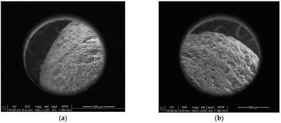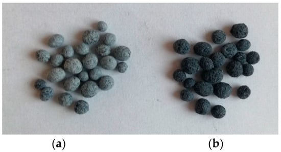 The digital photographs of two types of grainy bentonite-activated carbon composites are shown in Figure 2. Ben-AC-250 are brighter than Ben-AC-400. This is related to different calcination temperatures. The higher calcination temperature caused stronger dihydroxylation of bentonite. Structural changes caused by the elimination of hydroxyl groups lead to darkening and an amorphous state of matter [36]. The specificity of this state is a thermodynamic imbalance, which affects the high chemical activity of such material. Moreover, the surface morphology of Ben-AC-400 seems to be slightly more heterogeneous, rough, and porous than Ben-AC-250 (Figure 3). It is an effect of higher structure damages due to higher calcination temperatures. As the temperature increases, the activated carbon contained in the bentonite is combusted forming multiple internal pores and channels inside granules. Du et al. suggests that thermal modification is a crucial step in forming a porous structure of grainy clays [37]. Both changes (chemical activity, porous surface) generated by higher calcination temperature of Ben-AC-400 are favorable in the context of adsorption potential.