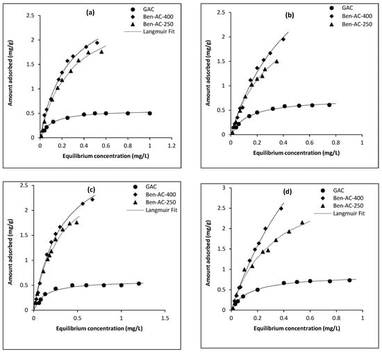 Langmuir adsorption isotherms of micropollutants (a) CBZ; (b) OP; (c) NP; (d) NP on granular activated carbon (GAC), Ben-AC-400 and Ben-AC-250.
