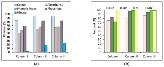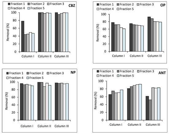 The effect of packing material in columns on the treatment of the effluent and removal of micropollutants is illustrated in Figure 5. Reduction of nitrogen compounds expressed as N-NO3 (nitrate) was poor in the studied columns, i.e., 3%, 18%, and 24%, in column I, II, and III, respectively. Phosphate was reduced by 69 % in column I and by 83% in column II and III. Bentonite clay is rich in aluminum oxides, which are active in the adsorption of anions such as nitrate and phosphate [44]. When different anions occur in the feed solution, strong competition is observed, and one of them is captured preferentially [28,45]. As a result, a strong competitive effect of phosphate on nitrate capture was observed. Gouram-Orimi et al. reported that nitrate uptake in a fixed bed column was limited mostly by phosphate than by the other ions, like bicarbonate or sulfate [46]. According to Schick et al. the adsorption mechanism of these ions is affected by geometry and charge density [47].