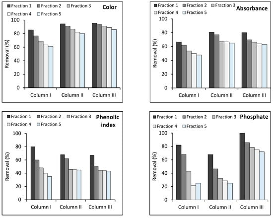 As shown in Figure 7, removal of micropollutants seems to be relatively stable compared to the rest of the parameters (i.e., color, absorbance, phenolic index, and phosphate). Interestingly, removal of anthracene increased slightly in time for all columns. These micropollutants varied in molecular weight and, thus, particle size. Anthracene has significantly lower molecular weight contrary to the other micropollutants. Probably, decreasing porosity of filtration bed in time was an enhancing factor for removal of anthracene as the effect of a sieve.
