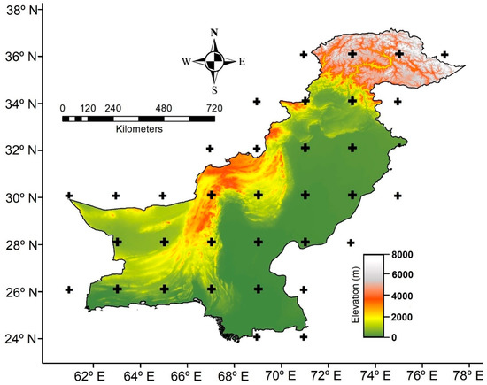 Pakistan (latitudes 24°00′ N–37°30′ N and longitudes 61° E–78° E) covers an area of 796,095 km2 showing a predominantly arid to semi-arid climate [30]. The topography of Pakistan significantly varies from a high and elevated region in the north to the coastal flat plains in the south (Figure 1), depending on which huge spatial and temporal variation in the climatic condition is observed. The precipitation also varies widely with less than 100 mm in the western and northwestern area and more than 1100 mm in the northeastern and northern part of the country. The precipitation is observed to increase from the arid southern coastal regions to the northern and northeastern region of the country. However, the major parts of the country have a precipitation less than 500 mm [31]. The south eastern parts of the country have the highest rainfall during summer (June–September) and least rainfall during winter (December–February), while the northern parts have the highest rainfall during winter and the lowest rainfall in summer. The maximum temperature is often above 50 °C in the south in May, while the minimum temperature is below −20 °C in the northern Himalaya and sub-Himalaya region in January [30].