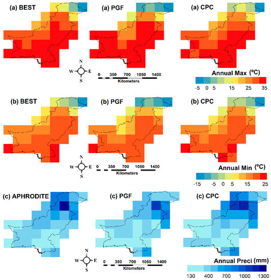 Spatial distribution of annual average of daily (a) maximum temperature; (b) minimum temperature; and (c) annual total rainfall estimated using different gridded temperature and rainfall data.
