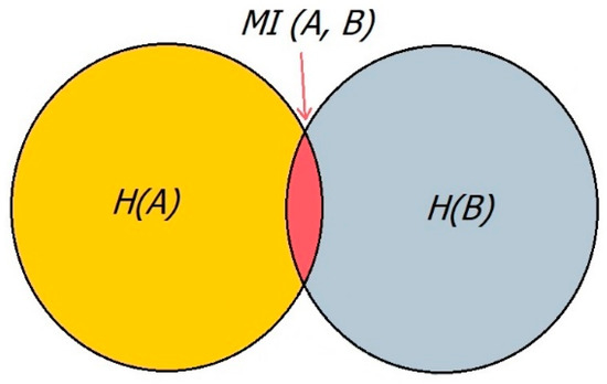 MI estimates common information between two variables as the difference between the sum of the entropies and their joint entropy: