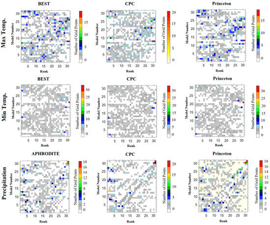 Ranking of the GCM according to their performance in replicating maximum and minimum temperature and precipitation. The x-axis represents the rank of the GCM while the y-axis represents the GCM number as described in Table 2. The color bar shows the number of grid points.